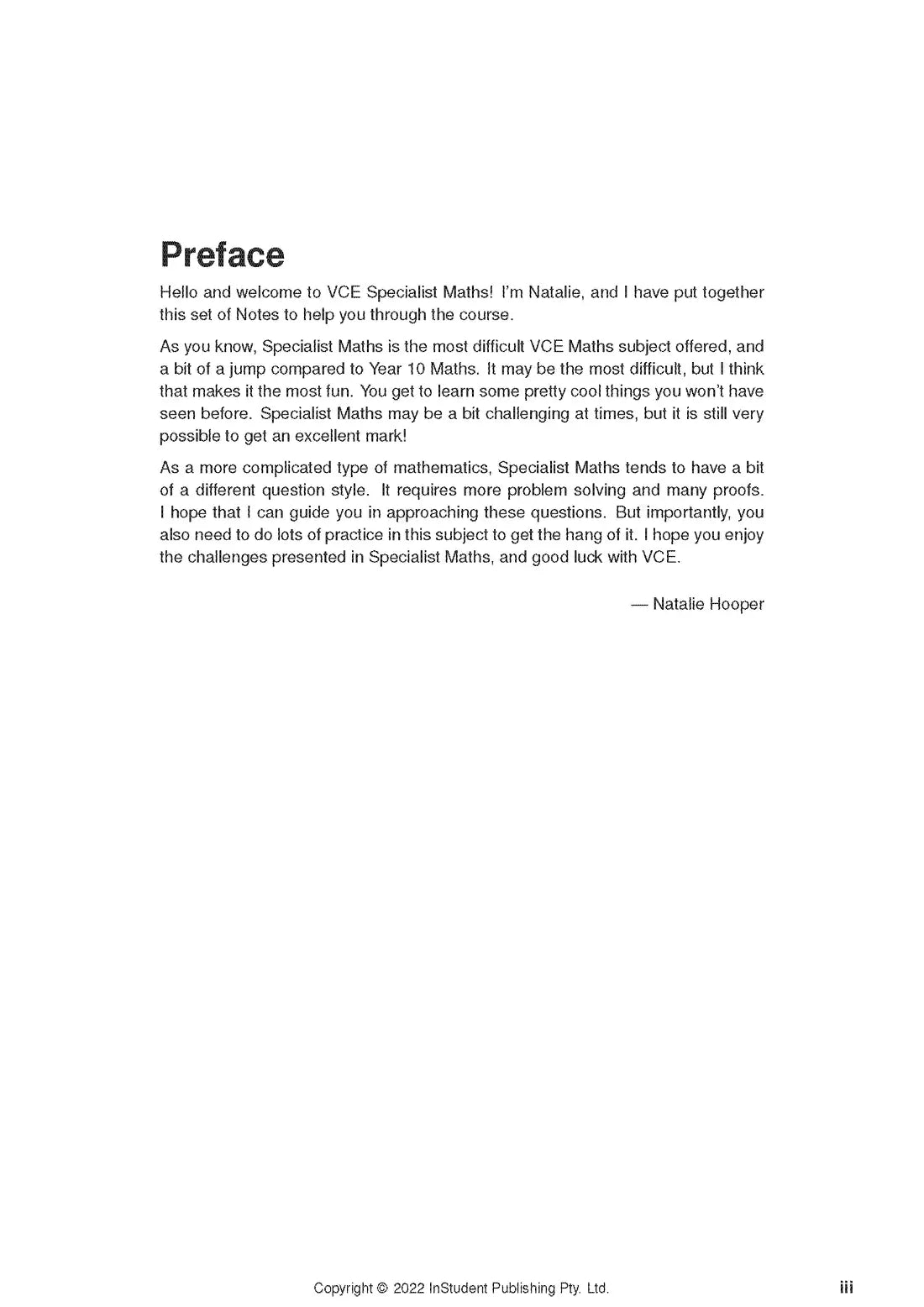 This book covers the entire Specialist Maths Units 1&2 course to prepare you for your SACs and exams. Every key concept and formula is clearly explained with an abundance of examples to ensure a solid theoretical and practical understanding. You will also find plenty of diagrams, calculator tips, and advice from a high-achieving former student who explains exactly what it takes to do well in Specialist Maths, setting you up for success next year in your 3&4 studies.