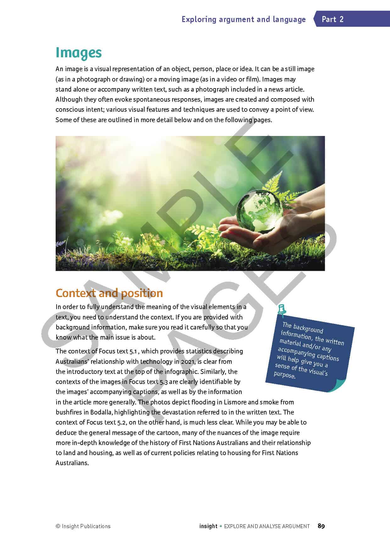 Insight’s NEW Explore and Analyse Argument provides comprehensive coverage of Area of Study 2 in Units 2 and 4 of the new VCE English/EAL Study Design, to be implemented at Year 11 from 2023 and Year 12 from 2024. Taking a step-by-step, scaffolded approach to the development of written and analytical skills, this practical resource covers the analysis of argument and of persuasive language in a variety of media texts, supported by an extensive range of stimulating activities. Bonus digital supplementary material caters to a wide range of ability levels and provides further opportunities for students to hone their analytical and writing skills.