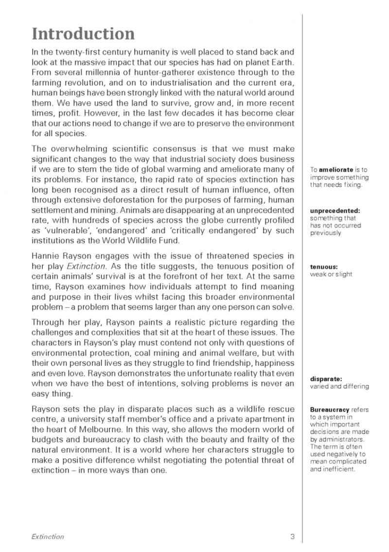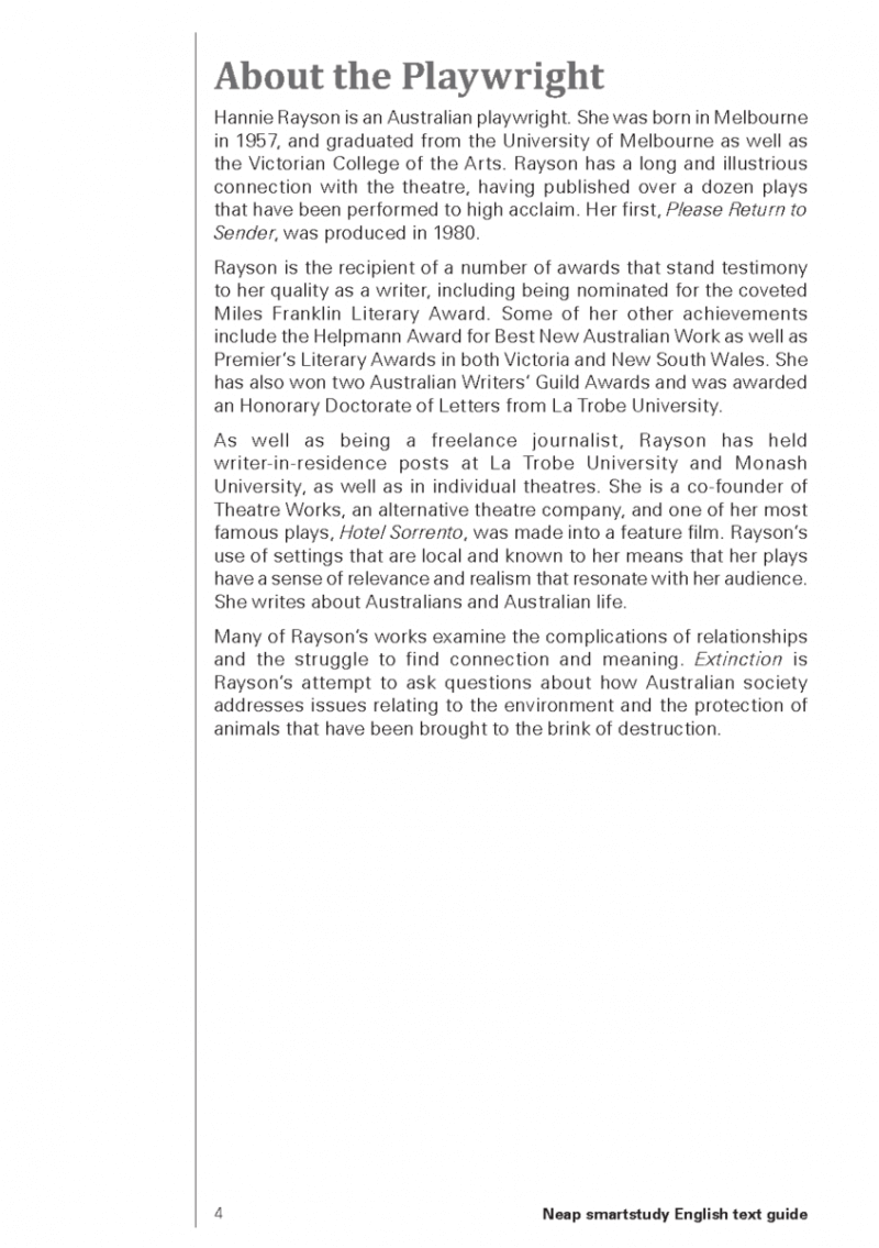The Neap English Text Guide to Extinction by Hannie Rayson enables students to acquire a deeper understanding of the text, to develop their own critical thinking skills, and to tackle their essays and exams with greater confidence.