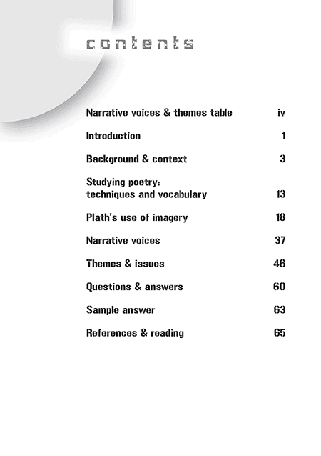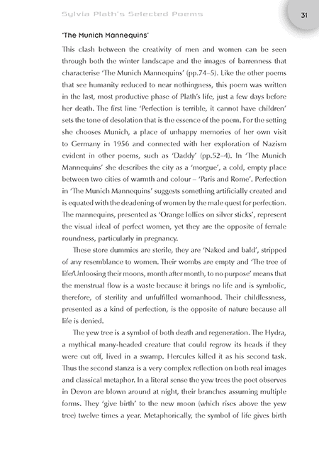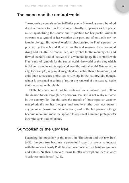 The Insight Text Guide Sylvia Plath’s Selected Poems analyses the Selected Poems, a collection chosen by Ted Hughes and first published in 1981. The following poems are analysed in some detail:
