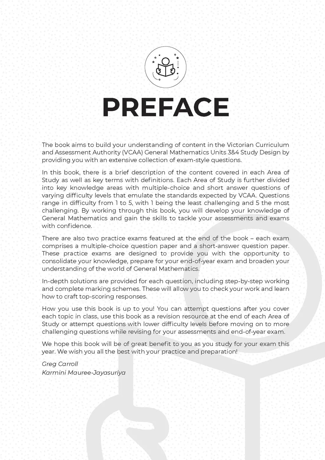 Each question emulates the scope and style of those on the VCAA exams. In addition, the difficulty ratings help you to develop an understanding of assessor expectations. At the end of each chapter, you will find detailed solutions and commentary that is written by an expert VCE teacher and explains the content and thought processes required to achieve full marks.